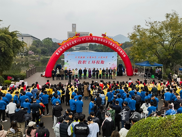 3月7日下午,为庆祝第114个“三八”国际劳动妇女节,以“爱岗敬业、爱生如子、爱校如家”为主题的教职工环校跑活动在冰球官网大学城校区三春湖观景平台拉开序幕。