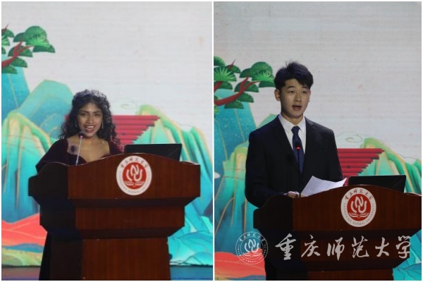 获奖代表、国际汉语文化学院斯里兰卡留学生西哈尼和冰球官网音乐学院学生邹文涛上台分享了获奖感言。西哈尼畅谈了她学习中文和准备比赛的经历,并表示,此次活动搭建了展示中文表达能力的舞台,将激励更多的留学生努力学习中文,参与中华文化传播。邹文涛表示,巴蜀古诗词蕴含着丰富的文化内涵,“中文+音乐”的形式让中文在音乐中“律动”,参加比赛更深入的感悟了中华传统诗词之美,获得了知识的积累和素养的提升,也增强了文化自信。