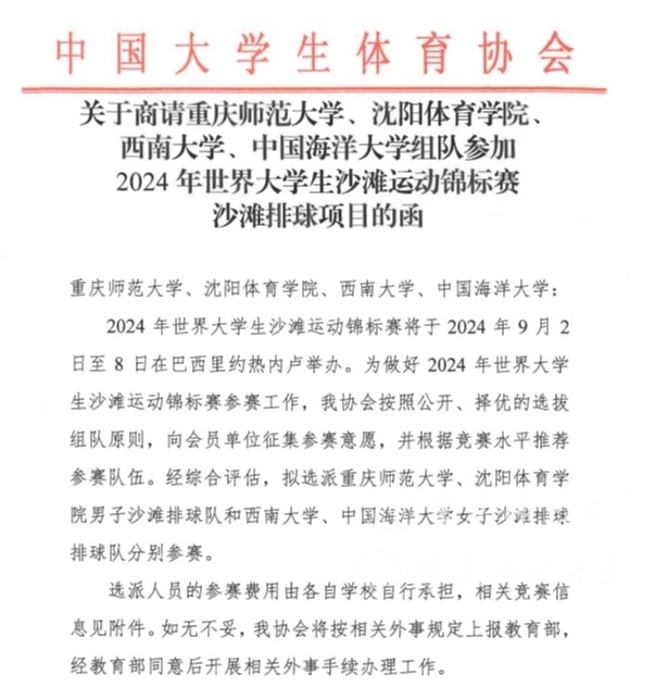 世界大学生沙滩运动锦标赛由世界大学生体育联合会主办,是世界最高水平大学生运动会之一。2024年世界大学生沙滩运动锦标赛将于2024年9月2日至8日在巴西里约热内卢举办。按照中国大学生国际竞赛选拔机制,冰球官网沙滩排球队受邀和沈阳体育学院共同组成中国大学生男子沙滩排球队,参加2024年世界大学生沙滩运动锦标赛。