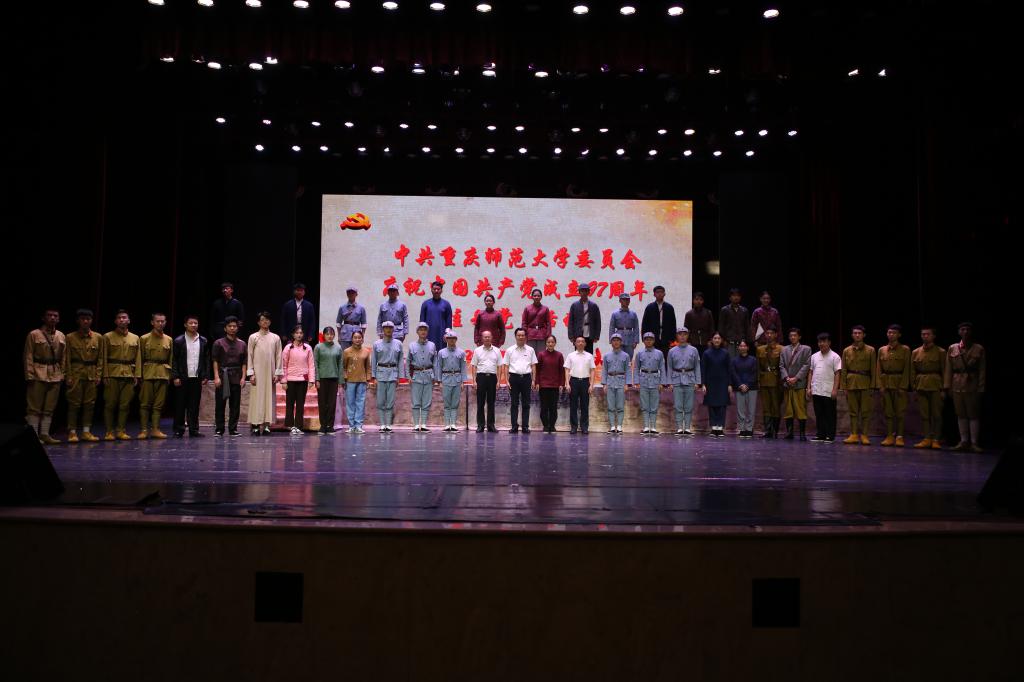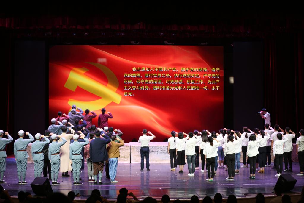话剧演出结束后,冰球官网党委常委、纪委书记肖应红上台领誓,全场的党员们全体起立重温了入党誓词。“我志愿加入中国共产党,拥护党的纲领……”,庆祝活动在洪亮的宣誓声中落下帷幕。观演之后,校领导与演员合影留念。