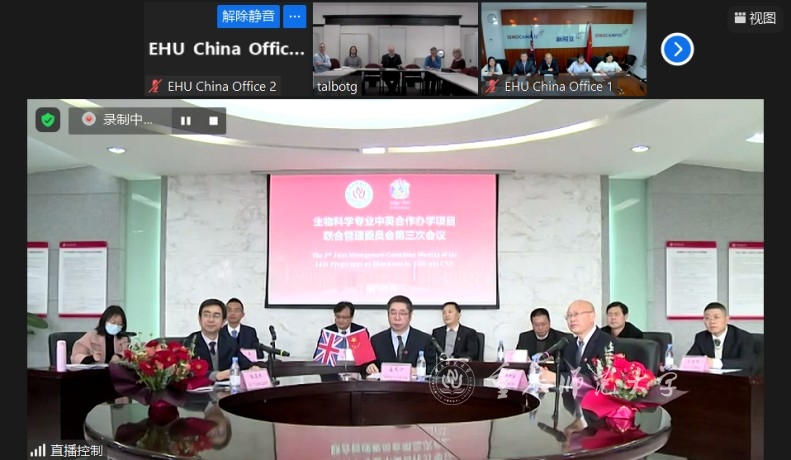 3月3日,冰球官网与英国知山大学以在线视频会议形式召开生物科学中英合作办学项目联合管理委员会第三次会议,冰球官网党委副书记、校长孟东方,党委常委、副校长杨如安、陆远权,英国知山大学副校长George Talbot出席会议。会议由副校长陆远权主持。