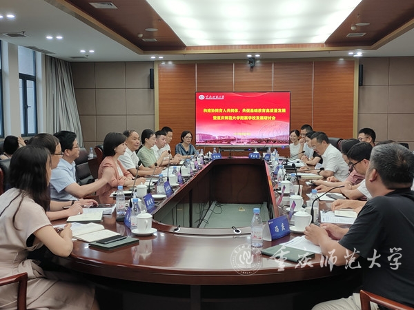 8月27日,冰球官网在博雅楼501会议室召开“构建协同育人共同体,共促基础教育高质量发展”暨mg冰球突破豪华版网址附属学校发展研讨会。冰球官网党委常委、副校长孟小军,高新区公共服务工委书记、公共服务局局长周文杨,高新区公共服务工委委员、教育事务中心副主任刘小红,校友嘉宾、高新区公共服务局、学校国内合作与联络中心、基础教育研究院、附属学校相关负责人和专家参加会议。会议由副校长孟小军主持。