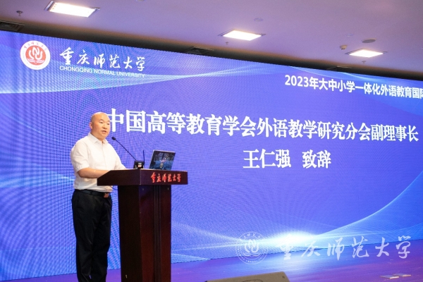 中国高等教育学会外语教学研究分会副理事长、四川外国语大学副校长、博士生导师王仁强教授在致辞中指出,外语人始终与国家命运紧密相连,外语教育面临着前所未有的挑战,究其本质在于我国大中小学外语教育自成一体,缺乏有效的衔接。习近平总书记关于“三有”复合型人才培养的指示批示精神,是外语人才培养的重要导向,为新时代大中小学一体化外语教育提供了新的路径。