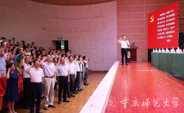 表彰会在庄严的国歌声中拉开帷幕。奏唱《国歌》完毕,全体党员举起右手、面向党旗重温入党誓词,由校党委书记曾礼同志领誓。