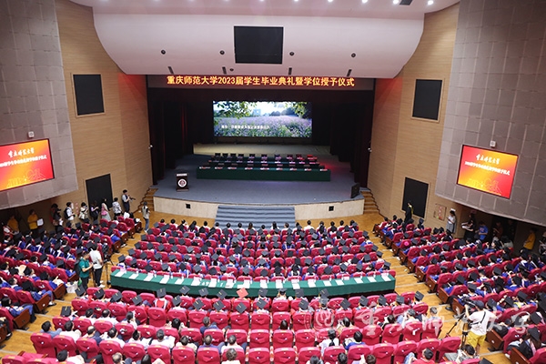 典礼正式开始前,毕业年级辅导员、毕业生和低年级学生代表等为毕业生们带来快闪献歌,《马鞭草花开的路口》《祝你一路顺风》《一起向未来》一首首歌曲或温馨感人,让同学们不由重拾美好时光;或青春激昂,祝福重师学子扬帆再起航。