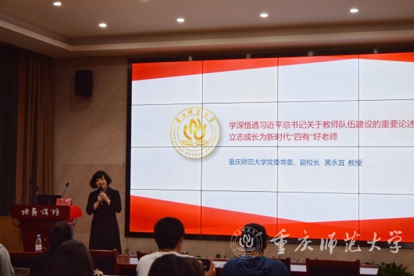 黄永宜教授以“学深悟透习近平总书记关于教师队伍建设的重要论述,立志成才为新时代‘四有’好老师”为题,从“深入学习习近平总书记关于教师队伍建设的重要论述”“立志成长为新时代‘四有’好老师”“从现在做起:学理论、讲政治、勤奋斗”三个方面展开讲座。