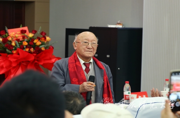 尹从华教授在答谢辞中表达了感天地覆载之恩,父母养育之恩,师长教诲之恩,感中国共产党、民进、重师培育之恩,以及家人、亲友、同志扶持之恩,并与参会人员分享了自己的励志箴言、人生信条、退休生活、内心独白和长寿密码。