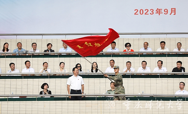 校党委书记、2023级军训师政委曾礼为军训师二团28连——王红旭连授旗,连长李鹏飞同志接旗。
