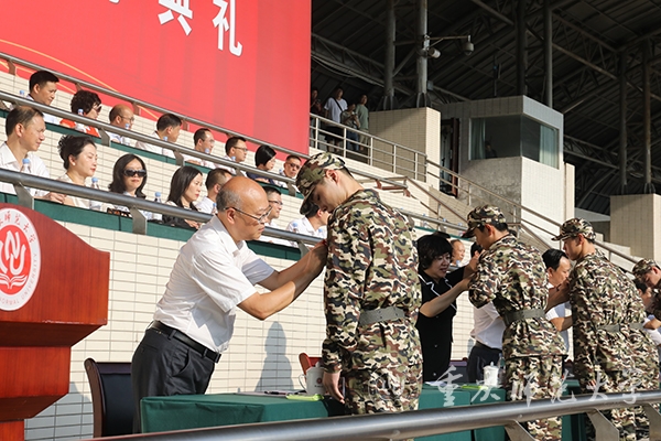 校徽佩戴仪式上,校领导为新生代表佩戴校徽。新生戴上校徽,昭示着他们将以重师人的身份在这美丽的校园书写属于自己的青春奋斗故事。