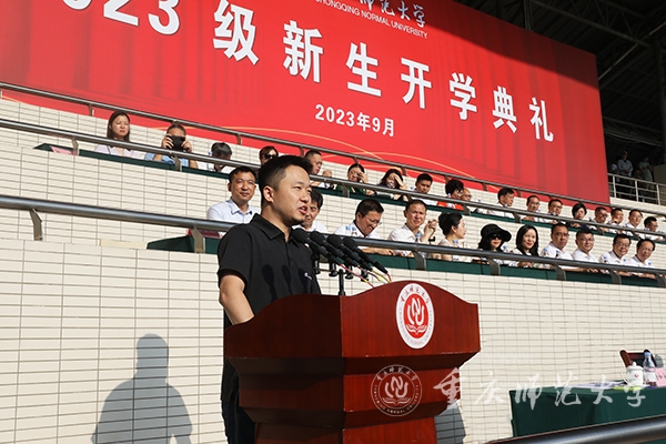 本科新生代表、新闻与传媒学院2023级新闻传播学类专业黄玺菘同学在发言中表达了成为重师人的骄傲之情。“大学是新的起点,我们将会在重师拥有全新的人生体验,获得知识,丰富阅历,在磨炼中成长为真正对国家与社会有用的人。”