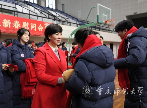在寒假留校学生新春慰问会上,张艳、黄永宜、付文升等与会领导为留校学生发放了新春大礼包和春节红包,全场师生齐唱《新年好》,现场一片浓浓温情。在寒假留校学生宿舍,校领导为同学们戴上了喜庆的红围巾,送上新年礼物。每到一处,校领导亲切询问留校学生留校原因,学习和生活有无困难,并叮嘱同学们要注意劳逸结合,多与家人联系,合理安排时间度过充实假期。张艳代表学校党委行政向同学们致以新春的问候和诚挚的祝福。她强调,刚刚过去的2024年是重师学子捷报频传的一年。2025年,希望广大同学自信自强、锐意进取,不断增强爱校荣校、强校兴校的责任感与使命感,以实际行动为学校各项改革建设贡献力量。