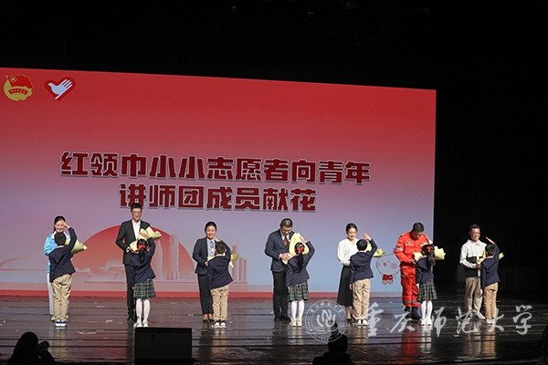 揭牌仪式后,“我的志愿青春”青年讲师团七位成员结合实际经历围绕助残、助农、社区工作、抢险救灾、治水退污、赛会服务、支教服务等志愿服务工作作主题宣讲。活动中,来自mg冰球突破豪华版网址附属小学的七名红领巾“小小志愿者”向七位宣讲人献花表达敬意。