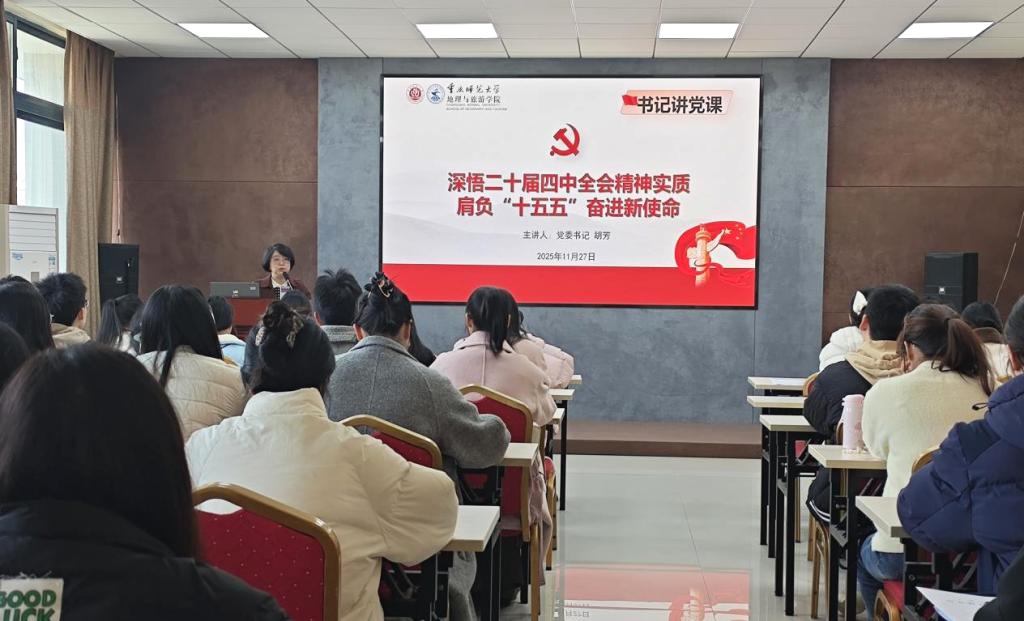 11月27日,地理与旅游学院“书记讲党课”系列学习教育第三讲举行,学院党委书记胡芳以“深悟二十届四中全会精神实质,肩负‘十五五’奋进新使命”为题开展了党课。她围绕五个核心维度层层深入,系统解读了党的二十届四中全会的重大意义、主要内容与实践要求。