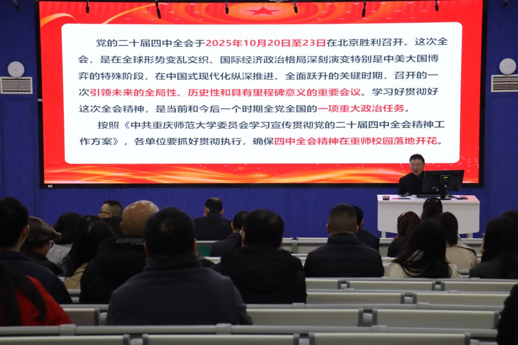 王国胤紧紧围绕习近平总书记在党的二十届四中全会上的重要讲话和全会《建议》,系统阐释全会的重大意义,带领教职工全面回顾“十四五”时期我国发展取得的重大成就,深入解读“十五五”时期的重要地位、指导方针、主要目标、战略任务和重大举措。会议还传达学习了市委六届八次全会精神,对谋深做实我市“十五五”时期经济社会发展工作,奋力谱写中国式现代化重庆篇章等内容进行了生动阐释。最后,会议就学校的实际情况提出要狠抓贯彻落实,以四中全会精神引领学校事业高质量发展的具体举措。